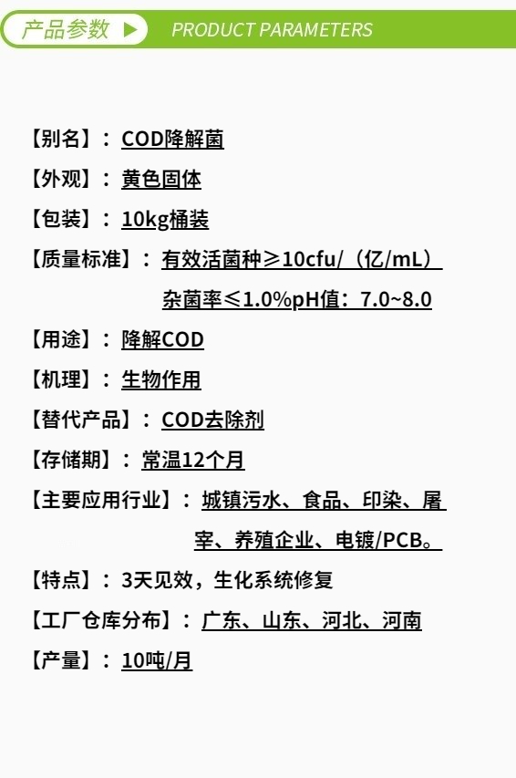 庫巴魯®COD激活菌301是針對生化系統(tǒng)中COD專門研發(fā)的高效COD去除菌,能降解廢水中的蛋白質(zhì)、淀粉、纖維素、糖類、油脂等碳氫化合物,提升優(yōu)勢菌群,有效抑制病原性微生物的繁殖。推薦閱讀:《滲濾液COD去除劑—清源牌》